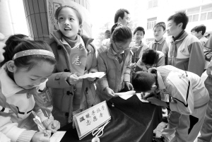 昨天,在中關(guān)村一小校園內(nèi)有六七個小分隊擺攤招募志愿者,除了系鞋帶外,潔廁、護(hù)綠、安全、節(jié)水節(jié)電、社區(qū)服務(wù)等都是志愿者分隊的服務(wù)內(nèi)容!跋M麑W(xué)生把‘志愿’意識融入生活,形成新的生活方式!痹搶W(xué)校有關(guān)負(fù)責(zé)人介紹說,新學(xué)期學(xué)校將實行志愿者注冊,為學(xué)生配發(fā)志愿者證。學(xué)生志愿服務(wù)的內(nèi)容和時間、參加培訓(xùn)的經(jīng)歷、獲得的榮譽稱號、志愿活動的證明人等都會詳細(xì)記錄在上面。學(xué)生參與志愿服務(wù)的時間每學(xué)期不得低于50個小時,中高年級學(xué)生還將參加校外的社區(qū)服務(wù)活動。晨報記者 李木易/攝