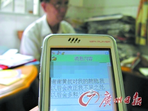 本報(bào)訊 (記者曾毅攝影報(bào)道) 今年74歲,曾任順德區(qū)人大代表的黃其廠老人,昨天終于等來了一條期盼多日的短信,“謝謝黃叔對(duì)我的鼓勵(lì),我以后會(huì)改正我不足之處,以后多和父母溝通!