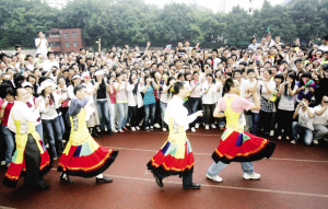 初三和高三的十幾名老師也來助興,女老師們一身中性的牛仔打扮甩開嗓子唱得正歡,男老師們則打了絲巾穿著長長的裙子跳著搞笑的舞蹈,有的老師自己也禁不住一邊跳一邊笑,笑痛肚皮的學(xué)生大有人在!疤阈,太好玩了,想不到平時那么嚴肅的老師還會跳舞!币晃桓呷哪型瑢W(xué)說。