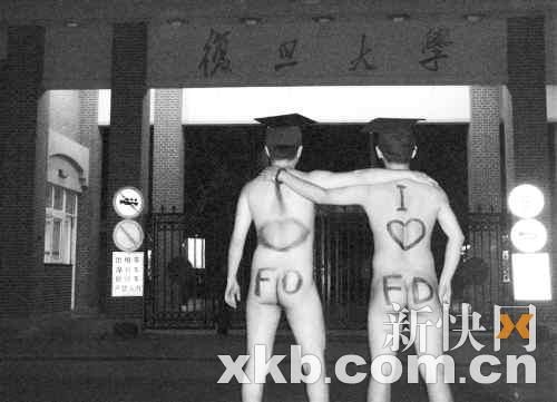 昨日,一條名為《復(fù)旦學(xué)生裸奔慶祝畢業(yè)》的圖文帖,火遍貓撲、天涯、華聲、網(wǎng)易等論壇。在貼出的圖片中,兩名男生頭戴學(xué)士帽,裸體在復(fù)旦校園內(nèi)奔走,并在學(xué)校大門、校訓(xùn)等多個地方留影。在網(wǎng)帖中,發(fā)帖者并未對兩名男生作介紹,但從其中一名男生在復(fù)旦的“恒隆物理樓”留影來看,網(wǎng)友們認為這兩名男生應(yīng)該是復(fù)旦物理系的畢業(yè)生。
