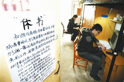 寢室長付寅解釋說,“休”一是指要合理安排休息時間,請同學(xué)們少串門;二是指改掉平時愛看電影、愛玩游戲的“惡習(xí)”!昂蠛軓垞P(yáng),主要是為了吸引同樓同學(xué)的注意。我們的大學(xué)生活時間所剩不多,我出這個點(diǎn)子,也是想讓大家監(jiān)督我們的行為”。海報上還寫明了一天的作息時間。為表決心,“休書”最后還有寢室全體成員簽名。