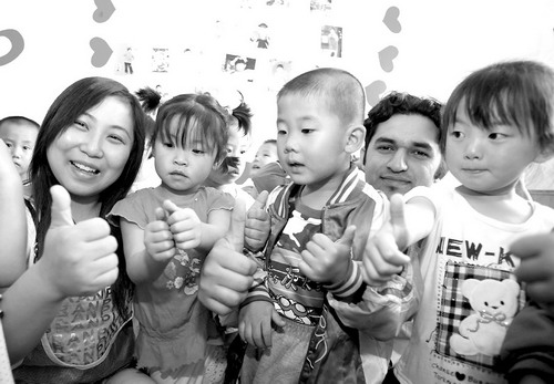 家住張家口橋東區(qū)的李曉霞從北京第二外國(guó)語(yǔ)學(xué)院畢業(yè)后,回鄉(xiāng)創(chuàng)業(yè)創(chuàng)建了“新東方幼兒園”,她既要面對(duì)家庭的重負(fù)和經(jīng)濟(jì)上的壓力,又要不斷提高創(chuàng)業(yè)的素質(zhì)和能力。在橋東區(qū)政府和婦聯(lián)的幫助下,如今她已成為擁有90多名兒童和十幾位教師的、在當(dāng)?shù)仡H具特色的雙語(yǔ)幼兒園的成功創(chuàng)業(yè)者。這是李曉霞(左一)和來(lái)自巴基斯坦的外教在教孩子們學(xué)唱英文歌。