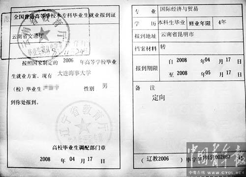 隨后,杜青拿到了學(xué)校發(fā)給他的《報(bào)到證》,報(bào)到單位為云南省交通廳,報(bào)到時(shí)間為2008年4月17日到2008年5月17日,《報(bào)到證》的“備注”一欄寫著“定向”。而此時(shí),他已經(jīng)畢業(yè)離開學(xué)校21個(gè)月了。