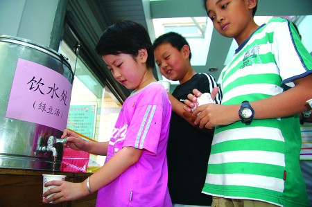 24日,槐蔭區(qū)中小學(xué)校進(jìn)行了本學(xué)期的階段性測試,記者在濟(jì)南市經(jīng)七路第一小學(xué)看到,學(xué)校為學(xué)生們熬好了綠豆湯,學(xué)校衛(wèi)生室為每個(gè)教室準(zhǔn)備了藿香正氣水、人丹、清涼油等防暑的藥品,保證學(xué)生安心考試。