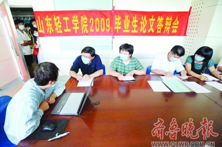 24日上午9點45分,一條標(biāo)有“山東輕工學(xué)院2009畢業(yè)生論文答辯會”的紅色橫幅掛在山大二院血液科會議室里,山輕工食品與生物工程學(xué)院的五位老師戴著藍色口罩一字排開,坐在一張長條桌的一側(cè)。張萍穿著住院服,戴著口罩在同學(xué)彭愛琴的攙扶下來到會議室。