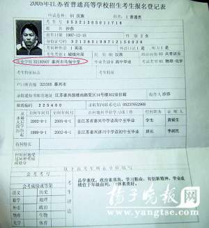 就讀于江蘇教育學院、今年大四的泰興籍女生沙莎,臨近畢業(yè)時才驚訝地得知,4年前那份證明她“身份”的《普通高等學校招生考生報名登記表》,“篡改”了她的“身世”,畢業(yè)學校明明是“江蘇省泰興中學”的她,被寫成了“泰興市馬甸中學”。結合女兒當年高考成績“很出乎意料”,昨天,擔心女兒成又一個“羅彩霞”的沙先生向本報記者反映,“很可能有人在故意篡改檔案”。