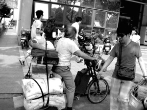 爺爺輩的送新族——一位頭發(fā)花白的老者騎著一輛電動(dòng)車,車后綁滿了大大小小的包裹、箱子。一個(gè)女孩皺著眉頭對(duì)老者抱怨著什么。原來,女孩因?yàn)楦改笡]能陪同前來非常生氣,她向老人埋怨說,別人都有父母代辦手續(xù),而自己必須獨(dú)自排隊(duì)繳費(fèi)。老人的銀發(fā)在風(fēng)中顯得零亂,額頭上滲出的汗珠在秋日的陽光里閃閃發(fā)亮。