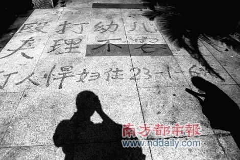 好事不出門,壞事傳千里。就是那沉重的一記耳光,蔣某成了小區(qū)“名人”,她所居住的23棟也成了鄰里關注的焦點。在該單位門口地上,一幅揮墨如潑的“書法”格外引人矚目,“毆打幼兒 天理不容 打人悍婦住23-1-××”,鄰居透露此乃被打男童蒙蒙(化名)爺爺?shù)慕茏鳌?/p>