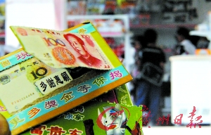 記者了解到,孩子們購買的“地下彩票”(見上圖,記者于濤攝)全都是5角一張。有的上面印著人民幣圖案,刮開后是什么面值的鈔票就能得到多少錢,有的就只能換到小玩具。眼看到了上學時間,孩子們還在不停地刮獎。
