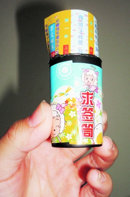 記者打開“求簽筒”,看到所謂“簽文”上寫有“恭喜,恭喜,你終于有喜”等內(nèi)容。記者仔細(xì)看了一下,竟發(fā)現(xiàn)“簽文”中有不少錯別字。