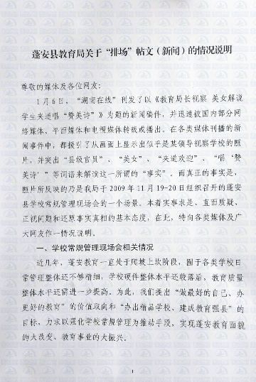 蓬安縣教育局今日在其官方網(wǎng)站刊發(fā)《蓬安縣教育局關(guān)于“排場”帖文(新聞)的情況說明》。