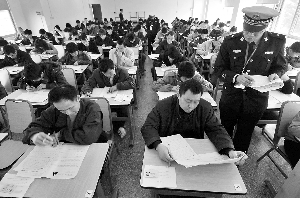 昨日早上剛到8:00,不少心急的考生已經(jīng)來到位于廣州城市職業(yè)學院廣園校區(qū)的交通協(xié)管員筆試考場!澳挲g小、學歷高的并不占絕對優(yōu)勢!苯痪ш犝翁幐敝魅、昨日的副主考官張湘濤告訴記者,報名者中不乏一些大專、本科學歷的人士,還有一個碩士研究生,但無奈視力不好體檢關過不了,無緣筆試。