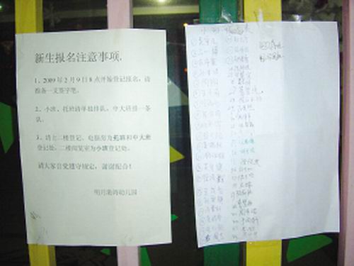 記者趕到現(xiàn)場時,看到幼兒園門前排起了上百人的隊(duì)伍,大部分人都帶著小板凳,有的甚至帶來了帳篷支在學(xué)校門口,看樣子要打持久戰(zhàn)。記者奇怪,現(xiàn)在才2月份,小孩要到9月份才能入園,有必要現(xiàn)在就排隊(duì)嗎?還冒雨。正在排隊(duì)的蘇先生告訴記者,明月港灣雙語電腦幼兒園貼出了告示,通知小區(qū)居民于2月9日早上8點(diǎn)到幼兒園登記報名,先到先得(號)。當(dāng)天中午,他咨詢了幼兒園,一位老師告訴他,去年幼兒園招小朋友,也是家長排隊(duì)的。如果排在后面,超過了幼兒園收生的限制,那就上不了了。蘇先生的兒子到9月份滿三周歲,就要上幼兒園了。同時蘇先生了解到,幼兒園小班是25人,但登記的人數(shù)已經(jīng)達(dá)到近50人了。蘇先生緊張起來,立刻加入到隊(duì)伍中,再朝前面一看,他排在第24位。接著就陸陸續(xù)續(xù)的有家長來排隊(duì),到晚上8點(diǎn)多,隊(duì)伍已經(jīng)有上百人了。