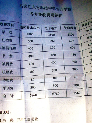 如果學(xué)生想自己找實(shí)習(xí)單位,就要交3000元錢。其中1000元是注冊(cè)費(fèi),2000元是伙食費(fèi)!拔覀兪桥c石家莊協(xié)和醫(yī)學(xué)院聯(lián)合辦學(xué)的,發(fā)的是那所學(xué)校的畢業(yè)證,注冊(cè)什么的都需要錢,這個(gè)錢就得學(xué)生來(lái)出!边@位老師說(shuō),從去年5月份開(kāi)始,學(xué)校的食堂就對(duì)學(xué)生和教職工免費(fèi)開(kāi)放了。小張去年7月從廣東打工回來(lái),暑假后來(lái)上學(xué),從9月到現(xiàn)在,在學(xué)校免費(fèi)吃了7個(gè)月的飯,按每月300元算,是2100元,學(xué)校收2000元是合適的。