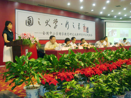 7月8日,全國中小學國學教育研究成都市青羊區(qū)現場會在蓉召開,來自北京、青島、重慶等地的上百名專家代表就國學教育在中小學校園內的開展進行了交流討論。據中國教育部語言文字應用管理司司長王登峰透露,有關部門準備邀請歌星演唱經典詩詞,以契合中小學生的年齡特點和心理需求。