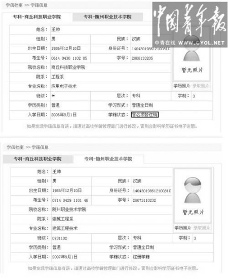 從學(xué)籍科老師處知道自己的身份可能被盜用的消息后,王帥登錄中國高等教育學(xué)生信息網(wǎng)查詢。他發(fā)現(xiàn)自己的身份下有兩個學(xué)籍信息,一個是自己2007年入學(xué)的隨州職業(yè)技術(shù)學(xué)院,另一個則顯示為:2006年9月1日入學(xué)商丘科技職業(yè)學(xué)院工程系應(yīng)用電子技術(shù)專業(yè),學(xué)制三年?疲瑢W(xué)籍狀態(tài)為已畢業(yè)。后者的姓名、出生日期、身份證等信息均與自己相同,考生號則為自己第一年參加高考的準(zhǔn)考證號。兩個學(xué)籍信息均沒有照片。