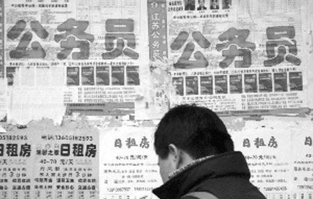 昨天,記者從南京幾所高校校內(nèi)信息公告欄里看到,公務(wù)員考試輔導(dǎo)班大有風(fēng)頭蓋過(guò)考研輔導(dǎo)班的趨勢(shì),連學(xué)生宿舍樓門口、餐廳門口公告欄上,也張貼著公務(wù)員考試輔導(dǎo)的招生海報(bào)。