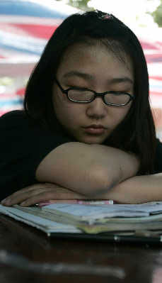 “還好當(dāng)時沒到上課時間,我們班上沒人被砸死。但是有幾個同學(xué)的家長可能受傷、出了點事!睆垇喦锇櫫税櫭碱^說,班上的師生遭遇地震后,有的不知道被安置到什么地方去了,有些則和家人逃出綿竹避難。對張亞秋來說,萬幸中的是,家中親人和同學(xué)們都無恙,張亞秋只得在災(zāi)民安置點中繼續(xù)高考復(fù)習(xí)。