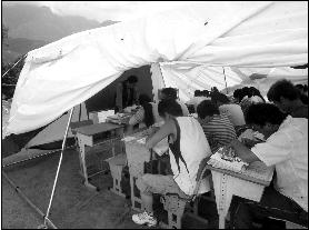 昨天下午,茂縣中學(xué)操場上架起了8個巨大的白色帳篷,帳篷上印有聯(lián)合國兒童基金會的藍(lán)色標(biāo)志。每頂帳篷里都坐滿了高三學(xué)生。為了散熱,帳篷兩側(cè)都被撩起來通風(fēng)。4點(diǎn)剛過,喧鬧的帳篷內(nèi)頓時安靜下來,其中一個帳篷里不久后傳出了一片讀書聲。旁邊的“教室”內(nèi)學(xué)生們安靜地做著卷子。記者悄聲問坐在帳篷邊的一位女生上什么課,她悄聲回答:“地理。”