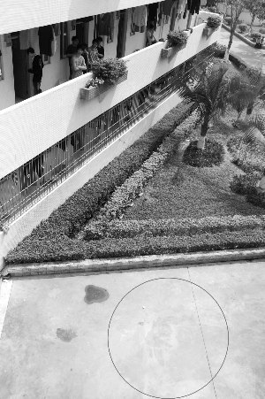 昨日中午12時許,記者趕到事發(fā)學校。在事發(fā)宿舍樓2號樓南側圍墻位置,仍可看見地面上殘留有一大攤血跡。相關部門工作人員正在宿舍樓內(nèi)進行調(diào)查。據(jù)該樓一名學生介紹,他們在凌晨6點多聽到外面很吵,跑出來一看,才知道是有人跳樓了,隨后很快就看到救護車和警車陸續(xù)趕到現(xiàn)場,據(jù)說跳樓的就是該校學生,已經(jīng)當場死亡。