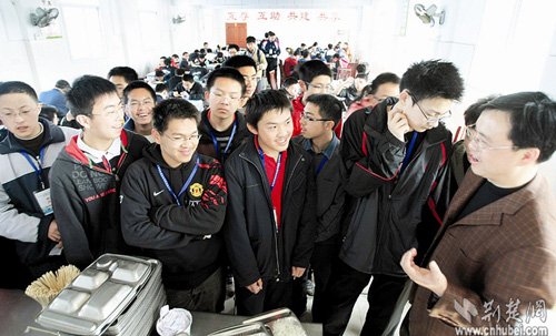 有的在看英語雜志,有的交頭接耳談得正歡,還有的在玩魔方或掌上游戲機(jī)……昨日在漢舉行的奧數(shù)中國國家集訓(xùn)隊(duì)集訓(xùn)開幕式前,34名來自全國各地的選手,顯得非常輕松。