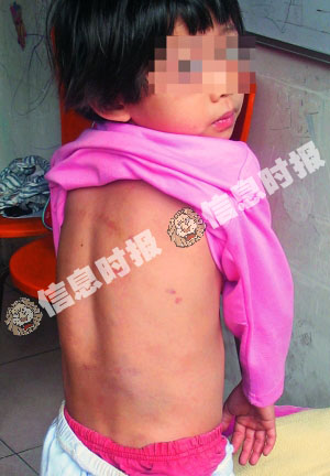彩姐還拿出當(dāng)天小晶晶被打后到醫(yī)院照的照片。記者一看,不禁嚇了一跳:小晶晶背部數(shù)處青紫,其中腰部位置的青紫有拳頭大小,還有一些地方出現(xiàn)紅色破皮擦傷。另外一張照片中,小晶晶的腿部數(shù)處出現(xiàn)條狀青紫,看得讓人心疼。彩姐說:“這些條狀傷都是他們用網(wǎng)球拍打的,疼得孫女好幾天晚上睡不著覺!