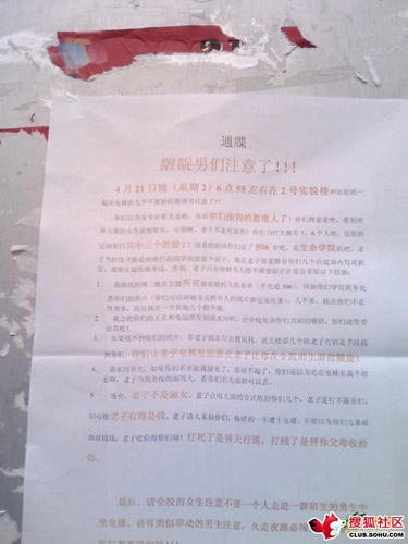 前日,位于成都清水河附近的一所高校教學樓前,張貼出一張醒目的告示,上面寫著“齷齪男們注意了”。告示上說,在本月21日傍晚6點55分左右,這位女學生在2號實驗樓與幾個男生一起乘電梯,被他們在電梯里戲弄,十分氣憤,她記下了幾個男生的臉和他們上課的教室。她要求幾個男生在本周內(nèi)寫道歉信,且要貼在該告示的旁邊。