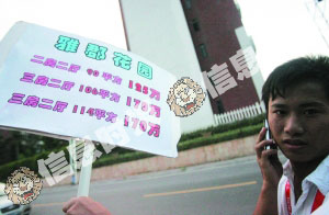 “賣樓、賣樓、105平方200萬(wàn)。”前天下午5點(diǎn),記者在海珠區(qū)濱江東路上目睹了一隊(duì)舉著木牌的地產(chǎn)中介在路上兜售叫賣二手樓。這種景象近日在廣州多處可見(jiàn),由于加息、限購(gòu)令對(duì)樓市的雙重影響,二手樓中介市場(chǎng)也遇到瓶頸,不少中介行已經(jīng)使出比應(yīng)對(duì)2008金融海嘯時(shí)更強(qiáng)的促銷招數(shù)。 看樓客普降三成 根據(jù)滿堂紅的統(tǒng)計(jì)數(shù)據(jù)顯示,自從加強(qiáng)版新政出臺(tái)后,廣州各區(qū)二手房的看樓客普遍減少了30%左右。記者了解到,不但看樓客減少了,一些原先有意賣房換大屋的業(yè)主也變得謹(jǐn)慎起來(lái)了。 “我們現(xiàn)在每天都要出來(lái)巡街!痹跒I江東路上,一位舉牌的合富中介小黃告訴記者。不僅僅是這家中介公司,附近的多家中介近日都自制了巡街用的木牌,這種木牌類似于運(yùn)動(dòng)會(huì)開(kāi)幕式運(yùn)動(dòng)員進(jìn)場(chǎng)的引導(dǎo)牌,牌子上貼著花花綠綠的紙張,寫著各類“筍盤信息”。一邊巡街,一些中介口中還念念有詞,大聲叫賣。路過(guò)的街坊無(wú)不覺(jué)得好玩,住在附近的石小姐說(shuō),“見(jiàn)過(guò)在路上叫賣包子的,還沒(méi)見(jiàn)過(guò)叫賣房子的”。
