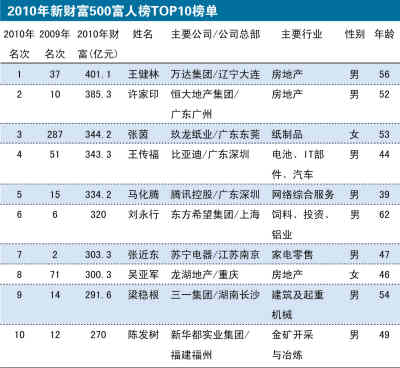 上周末,《新財富》雜志發(fā)布2010年“新財富500富人榜”,上榜富人財富總額為28756.5億元,較2009年增長76.6%。萬達集團王健林以401.1億元位居首富;許家印以385.3億元位列第二;張茵以344.2億元位列第三。