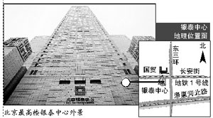 位于東三環(huán)國貿(mào)橋的西南角,矗立在長安街的南邊,主樓高達249.9米。中國指數(shù)研究院的調(diào)查表明,銀泰中心是目前北京在售總高度最高的樓盤。