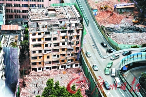 昨天下午,在東濠涌高架橋東側(cè)的圍蔽區(qū)內(nèi),錢路頭后街15號、18號兩棟樓早已完成拆遷,等待拆除。15號是一棟八層住宅樓,西側(cè)幾乎與高架橋“臉貼臉”。可就在距離高架橋幾米處,兩道幾十厘米寬的裂縫從樓頂直灌而下,裂縫中間只有數(shù)根鋼筋相連。從對面高樓往下望,筆直的裂縫直通地面,就好像用斧子劈開的一樣。