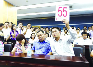 55號舉牌的是一位戴著眼鏡的年輕男士,只要聽到主持人報出一個號碼,就立刻舉牌,基本不與身邊坐著的人談話,志在必得;他身邊的中年男士保持微笑,中年女士則神色凝重低頭看手機。坐在最后一排的1號單位代表是一位頭發(fā)花白、約50歲開外的男士,他甚至看也不看一眼坐在前方的1號,緊緊地盯著臺上的主持人,只要主持人報出價格,立刻將手中的號碼牌舉過頭頂,動作干脆利索。