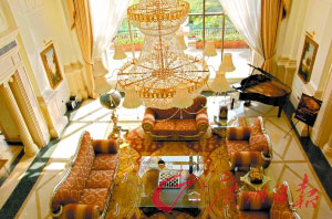 推開這座四層、總面積近2000平方米的意大利文藝復興時期風格別墅的雙面大門,奢華之氣撲面而來。這個近200平方米的客廳里靠近陽臺一側(cè)擺放著價格堪比頂級賽車的鋼琴,價值398萬元。