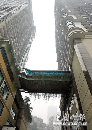 嘉園有業(yè)主500余戶,錦園有業(yè)主600余戶。當(dāng)初,開發(fā)商特意在兩樓之間設(shè)計(jì)了一座天橋,目的是讓兩個(gè)小區(qū)的空中花園、健身器材等可以共享,更重要的是方便兩個(gè)小區(qū)業(yè)主出入——錦園的業(yè)主可以經(jīng)嘉園直達(dá)臨江門、解放碑,嘉園業(yè)主也可經(jīng)錦園到一號橋。