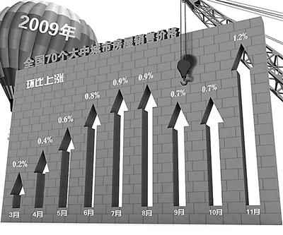 國家統(tǒng)計局對2009年房地產市場的監(jiān)測報告表明,從今年5月份開始,樓市在“反彈”、“回暖”中驟然升溫,隨后房價一路狂飆。11月份,全國70個大中城市房屋銷售價格同比上漲5.7%,漲幅比10月份擴大1.8個百分點。新建住宅銷售價格同比上漲6.2%,漲幅比10月份擴大2.2個百分點。在一線城市,相比年初,很多樓盤的成交價格均已翻了一番。