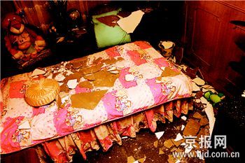 前天晚11時許,家住芍藥居北里306號樓1207室的李先生先聽到一聲巨響,后來看到的一幕讓李先生心驚膽戰(zhàn):臥室的大半個房頂?shù)乃嗟袅讼聛,床上、桌上、地上全是掉落的碎片和渣土?/p>