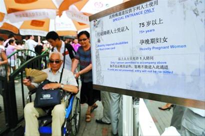 從今天(1日)起,世博園里75歲的老年人和行走不便的殘疾人享有走綠色通道的權(quán)利,而原先不少場館對孕婦和三四歲以下的兒童開放的綠色通道,從今天起不再適用。記者上午在世博園里看到,有一位孕婦模樣的游客欲走綠色通道時(shí),被工作人員婉拒。