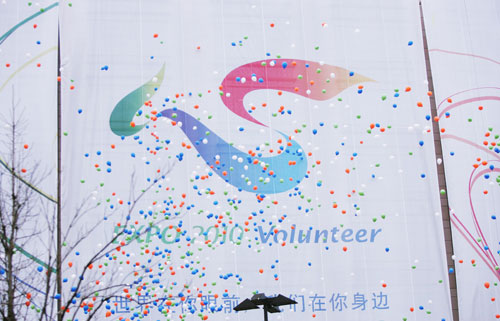 儀式上,中共中央政治局委員、中共上海市委書記、上海市世博會(huì)籌辦工作領(lǐng)導(dǎo)小組組長俞正聲揭曉了上海世博會(huì)志愿者標(biāo)志,同時(shí)懸掛在新世界商廈外墻的巨幅樓體公益廣告隨之揭曉。中國2010年上海世博會(huì)志愿者標(biāo)志的主體由漢字“心”、英文字母“V”、嘴銜橄欖枝飛翔的和平鴿構(gòu)成。與世博會(huì)會(huì)徽“世”異曲同工,在呈現(xiàn)中國文化個(gè)性的同時(shí),表達(dá)了志愿者的用“心”和熱“心”。“V”是英文“Volunteer”的首字母,闡述了標(biāo)志所代表的群體,賦予其清晰的含義;飛翔的和平鴿代表上海,也象征和平友愛,橄欖枝則寓意可持續(xù)發(fā)展和希望,傳承“城市,讓生活更美好”的世博會(huì)主題。彩虹般的色彩,迎風(fēng)飄舞的彩帶,是上海熱情的召喚。我們相信,2010年,在志愿者的努力下,來自世界各地的人將融洽地聚集在同一片天空下!