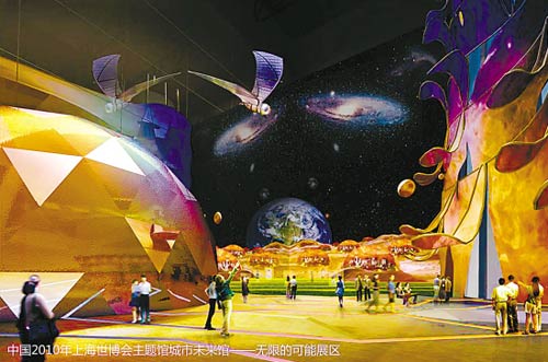城市未來館的設計師重點推薦“未來就在這里”和“無限的可能”兩個展區(qū)!拔磥砭驮谶@里”展區(qū)是一個動態(tài)城市模型的舞臺!盁o限的可能”將在“和諧廣場”上,放映暢想未來城市的各種可能性的動畫電影。