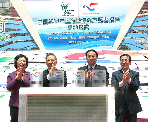 在東方明珠廣場,1500多位曾在上海舉辦的歷次重大活動中奉獻愛心的志愿者和各界市民代表齊集于此,參加世博會志愿者招募工作啟動儀式。啟動儀式前,上海市領導與志愿者代表們一起觀看了在北京天安門廣場舉行的中國2010年上海世博會天安門計時牌揭幕儀式的現(xiàn)場直播。上海市人大常委會主任劉云耕,上海市政協(xié)主席馮國勤,中共上海市委副書記、市文明委常務副主任殷一璀,上海市副市長、市迎世博600天行動城市管理指揮部總指揮沈駿共同開通了世博會志愿者招募網(wǎng)站報名系統(tǒng),全市72個志愿者工作站和上海世博志愿者網(wǎng)等6家網(wǎng)站同時開始面向社會接受志愿者的報名。中共上海市委常委、宣傳部長、市世博會籌辦工作領導小組志愿者組組長、市迎世博600天行動社會動員指揮部總指揮王仲偉發(fā)表致辭,歡迎廣大市民和國內(nèi)外人士踴躍參與上海世博會的志愿服務工作。中共上海市委常委、浦東新區(qū)區(qū)委書記徐麟,市人大常委會副主任王培生,市政協(xié)副主席、世博會執(zhí)委會副主任周漢民共同為世博會志愿者自行車宣傳隊授旗。