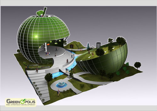 羅馬尼亞國家館的蘋果外形和標志文字“GREENOPOLIS”體現(xiàn)了健康生活方式的重要性、對可持續(xù)發(fā)展理念的關(guān)注以及針對現(xiàn)代社會普遍存在問題的以知識為本的解決方案。