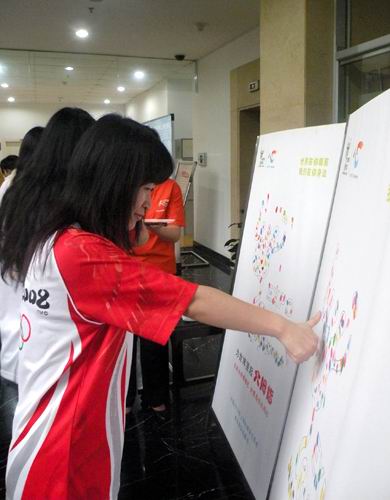 5月23日,恰逢北京奧運(yùn)火炬上海站傳遞一周年之即,中國(guó)火炬手聯(lián)盟上海分會(huì)在位于浦東新區(qū)的世博會(huì)志愿者工作站舉辦了“情系世博盛事,再傳奧運(yùn)輝煌”的公益活動(dòng),來自全國(guó)各地的近三十位2008北京奧運(yùn)火炬手提出倡議,申請(qǐng)加入2010年上海世博會(huì)志愿者的行列,響應(yīng)“世界在你眼前,我們?cè)谀闵磉叀钡闹驹刚呖谔?hào),延續(xù)“和諧關(guān)愛”的奧運(yùn)火炬手精神。