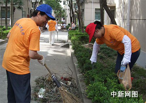 中新網(wǎng)上海7月15日電(鄭瑩瑩 田佳)十五日是上海迎世博的“環(huán)境清潔日”,一大早,毗鄰中國館的浦東世博社區(qū)周家渡街道就開始整潔社區(qū)“容貌”大作戰(zhàn),百余名志愿者身著橙色衣服,清理社區(qū)衛(wèi)生死角,讓社區(qū)內(nèi)刮過一陣“清潔風”。