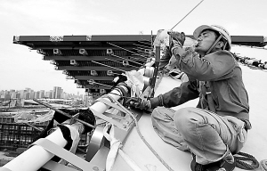 下午兩點(diǎn),記者帶著溫度計(jì)來到世博工地外國館片區(qū),陽光下,水銀柱停留在40攝氏度上。走上5分鐘,汗水濕透了全身。高溫挑戰(zhàn)著每個(gè)建設(shè)者的意志力。在法國館將要完成的鋼結(jié)構(gòu)屋頂上,幾個(gè)工人正在安裝最后的鋼架,為了避免曬傷,他們穿著長袖長褲的工作服,戴著安全帽。從屋頂爬下來時(shí),每個(gè)人都像是剛從水里撈上來的。工人老張說,安全帽不能脫,汗水一刻不停地沿著帽子流下來,眼睛都睜不開,得一直用手擦。