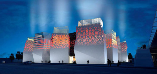 以“新俄羅斯:城市與人”為主題的俄羅斯館由12個塔樓和“懸浮在空中”的立方體組成,外形設計類似古代斯拉夫人的小村落,象征著生命之花、太陽以及世界樹(斯拉夫人枝葉繁茂的橡樹)的根。塔樓由白、金、紅三種顏色構(gòu)成,白色和金色塑造了俄羅斯建筑的歷史形象,而紅色底色加上富有俄羅斯各民族元素的圖案,則賦予了塔樓頂部鏤空部分以生命力。