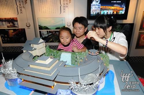 一位老人帶著他的小孫女在貴州館模型前仔細(xì)觀賞,“孩子你看,這個(gè)是黃果樹瀑布,這個(gè)是苗族女孩子在節(jié)日里穿的衣服,這個(gè)是……”老人表示,這是一個(gè)很好的機(jī)會(huì),帶孩子來了解一下自己年輕時(shí)工作的地方,也讓她能夠多增長一些世博知識。更重要的是,貴州可以說是他的第二故鄉(xiāng),前來參觀也是為了對貴州參展表示支持。