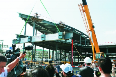 一邊籌資一邊建館的美國(guó)館,直到今年7月份才遲遲開工,雖然在參展資金上有些捉襟見(jiàn)肘,但其6000平方米的占地面積仍然是所有外國(guó)自建館中最大的之一。讓人吃驚的是,美國(guó)館僅用了兩個(gè)多月的時(shí)間,就完成了總體結(jié)構(gòu)封頂(見(jiàn)上圖),可謂是后來(lái)居上。在建設(shè)工期上取得如此效率,和上海方面的積極配合協(xié)作是分不開的。14日下午,新任美國(guó)駐華大使親臨世博園,參加了美國(guó)館的封頂儀式。