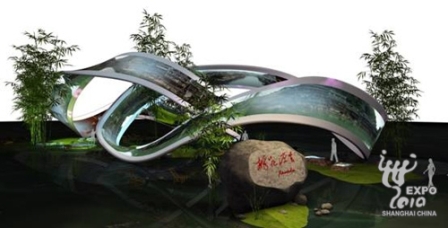 湖南館取名為“桃花源里·Xanadu”——Xanadu英文意為“世外桃源”,是西方世界描述神秘仙境時最廣泛使用的詞。湖南館的展示主題是“都市桃花源”。展館外觀之所以采用雙“魔比思環(huán)”相扣的造型,是取義無窮大符號“∞”和中國太極,這與和諧自然的中國理想城市意境以及長株潭城市群“兩型社會”的理念相契合。“魔比思環(huán)”是雙環(huán)環(huán)繞,就單環(huán)而言展開長度達100米,高3米,只有一個面和一個邊界。由于主體造型是不規(guī)則的建筑環(huán)體,對施工和投影都帶來了重大挑戰(zhàn)。