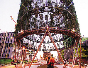 高大的“氣候樹”冠上覆蓋著巨大的銀色薄膜,因?yàn)橛羞@層太陽能鍍膜,樹內(nèi)的能源自給率大大提高,光照下溫度也降下8-10攝氏度!皻夂驑洹钡拿Q可謂名副其實(shí)。雖然造型不夠另類眩目,但實(shí)用、環(huán)保、節(jié)能的設(shè)計(jì)理念,以足以讓其成為新型城市公共建筑的典范。