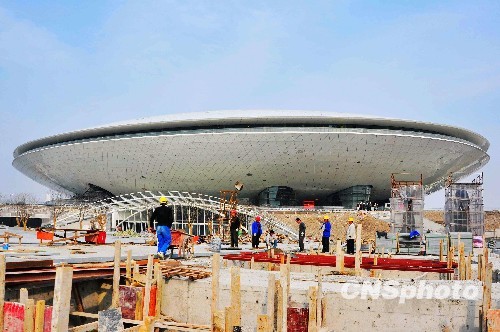 3月10日,距離2010年上海世博會開幕還有52天,世博園區(qū)工程已經(jīng)完成了95%以上,一軸四館中開工最晚的世博文化中心,其內(nèi)部已進(jìn)入最后的裝修收尾階段。配套的水、機(jī)電等系統(tǒng)開始進(jìn)行調(diào)試,外部的草坪鋪設(shè)和道路修整也進(jìn)入沖刺階段,預(yù)計所有工作將確保在本月底完成。中新社發(fā) 沈春琛 攝